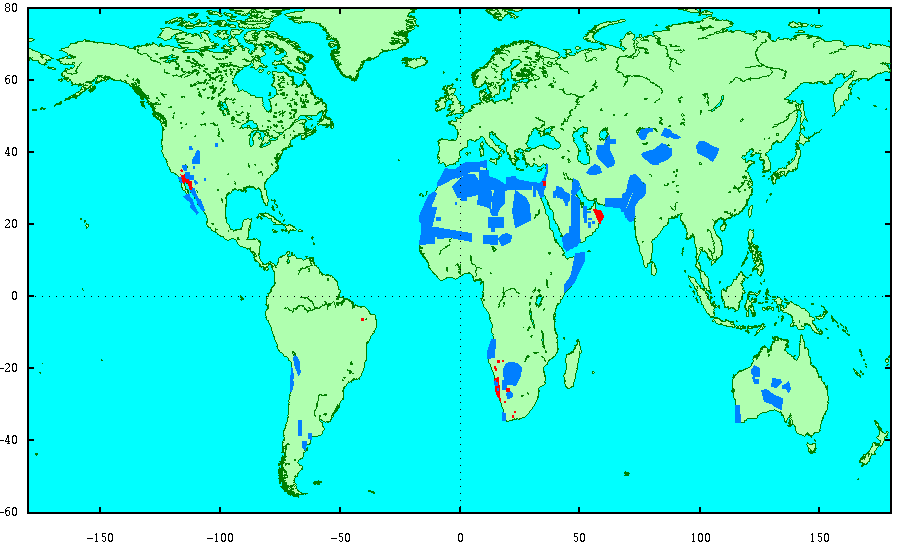 Figure 1. Desert/Arid land locations targeted for the global deserts monitoring project of ASTER (blue regions = low priority, red regions = high priority). See Table 1 for city names and exact locations.