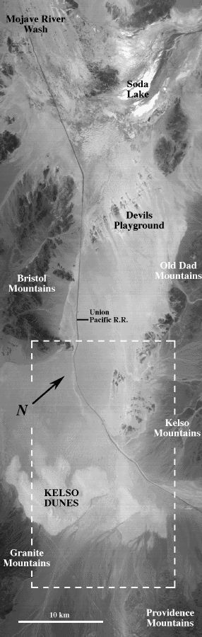 primary Kelso Dune sand transport pathway from the Mojave River Wash. The data, acquired